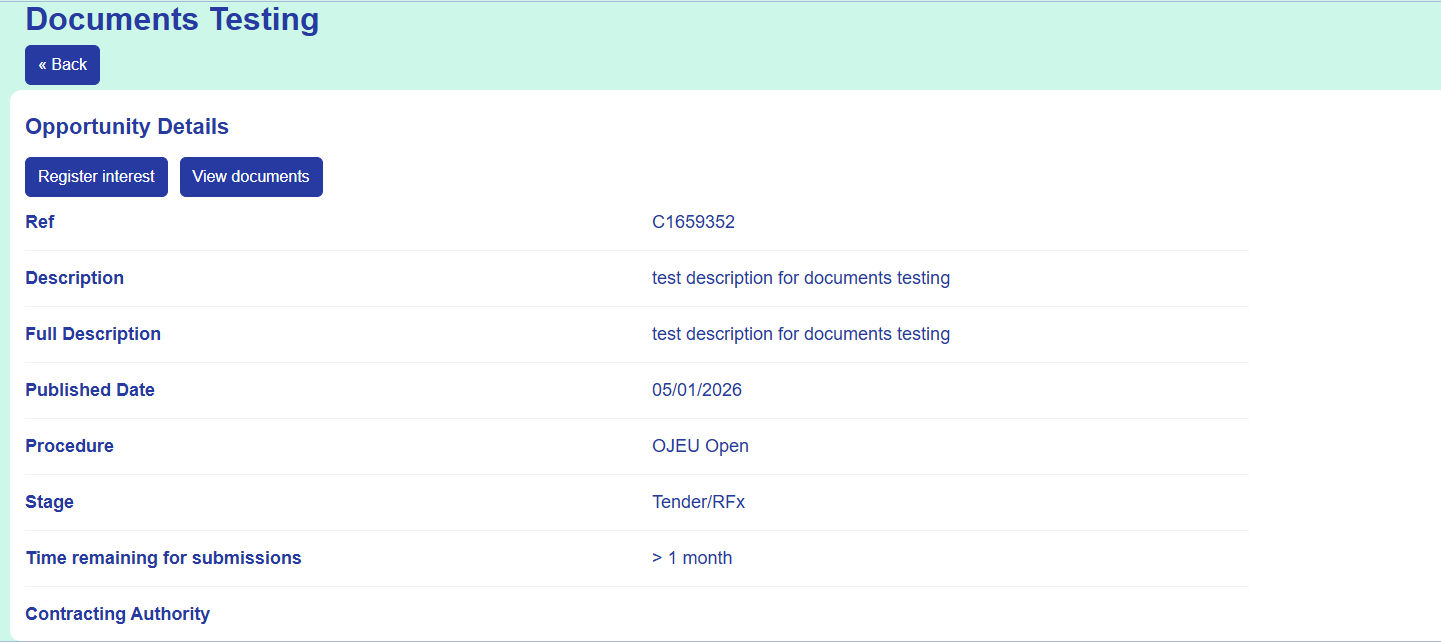 From the Find Opportunities page, click on the title of an opportunity. If the tendering project is at the stage where it is open for suppliers to express interest, you will be able to click Register Interest.